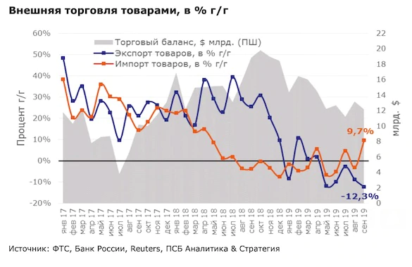 Потеря сырьевых доходов создает риски и для рубля: приток валюты сокращается, а отток на импорт устойчиво растет впервые с начала 2018 года, что связано, вероятно, с закупками машин и оборудования под инвестпроекты, говорит Попов.
