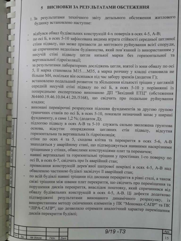 По данным предоставленного отчета, причиной обвала стало разрушение средней несущей стены подвала по оси Б, в осях четыре и пять.