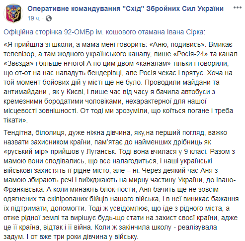 Аня, когда проезжала блок-посты, увидела экипированных бойцов и решила сама им чем-то помочь. Так девушка и стала воином после окончания школы, ведь поняла, что это тоже ее война и надо защищать родную землю. С тех пор прошло 3 года, а Аня боец 92 ОМБр имени кошевого атамана Ивана Сирко. Она поделилась тяжелыми моментами в военной жизни и рассказала о боевом крещении.