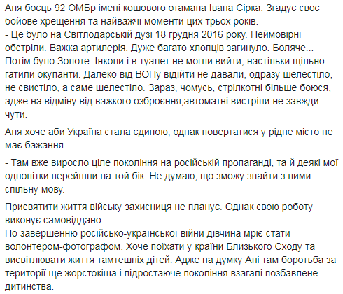 "Это было в Светлодарск дуге 18 декабря 2016. Невероятные обстрелы. Тяжелая артиллерия. Очень много ребят погибло. Больно ... Потом было Золотое. Иногда и в туалет не могли выйти, настолько плотно били оккупанты. Далеко от ВОПу отойти не давали, сразу шелестело, а не свистело, а именно шелестело. Сейчас почему-то стрельбу больше боюсь, ведь в отличие от тяжелого вооружения, автоматные выстрелы не всегда слышно", - сказала защитница.