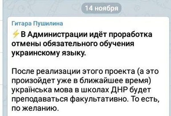 «В администрации (Пушилина. — Авт.) идет проработка отмены обязательного обучения украинскому языку. После реализации этого проекта (а это произойдет уже в ближайшее время) українська мова в школах „ДНР“ будет преподаваться факультативно. То есть по желанию», — написал на своей странице в соцсети «ВК» главарь оккупационной администрации Горловки Иван Приходько. А Приходько не просто «градоначальник», которому прочат повышение, а, можно сказать, рупор общественного мнения — член многих влиятельных общественных советов, подконтрольных кремлевским кураторам «республики».