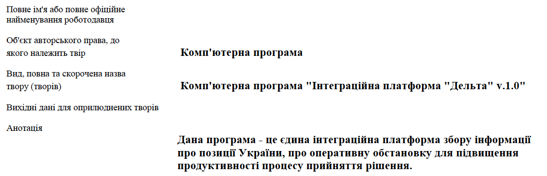 В открытом реестре “Авторське право і суміжні права. Офіційний бюлетень № 47, 2017” по ссылке с сайта Минэкономразвиия, на страницах 156 и 157 опубликован полный перечень стейкхолдеров “ситуационной комнаты”, то есть “Дельты”. Под номером свидетельства про регистрацию авторского права №74378 от 25.10.2017 значатся: Утюшев Марат Масихатович, Гончар Ярослав Анатолійович, Хазін Натан Аркадійович, Гальчинський Сергій Анатолійович, Колесніков Сергій Олександрович, Кулініч Ярослав Сергійович, Мельников Дмитро Петрович, Остроух Сергій Михайлович, Савченок Олександр Васильович, Холмогоров Сергій Олександрович, Шишкін Денис, Ігорович, Анацький Ян Германович, Бойко Єлизавета Сергіївна, Коваль Андрій Олександрович, Лукашенко Євгеній Олегович, Мартиненко Артем Геворкович, Парнюк Ігор Олександрович, Раєвський Олександр Вячеславович, Шелар Руслан Русланович, Караім Євгенія Олегівна, Дикий Олександр Вікторович
