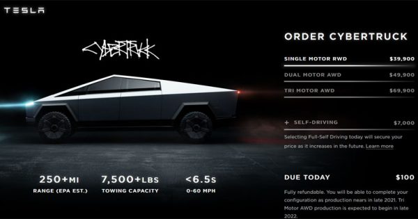 Tesla уже принимает заказы на сайте. Для предварительного заказа нужно оставить депозит в размере $100.