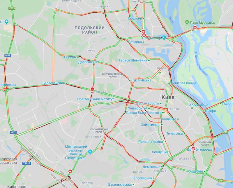 Затруднено движение транспорта на Голосеевском проспекте, проспекте Валерия Лобановского, Отрадном проспекте, проспекте Леся Курбаса. Пробки зафиксированы возле станций метро "Университет", "Вокзальная", "Дворец спорта", "Дружбы народов", "Лыбидская". Пробки образовались на Северном мосту, Дарницком мосту, мосту имени Патона и мосту Метро.