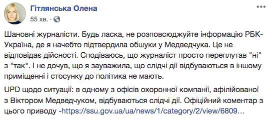 Спустя некоторое время Гитлянская обновила свой статус и сообщила, что обыск действительно проводили. В СБУ сообщили, что следственные действия проходили в охранной фирме, но, в отличии от Гитлянской, ее не называли.