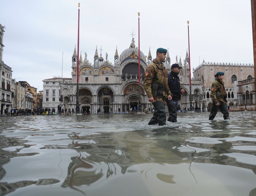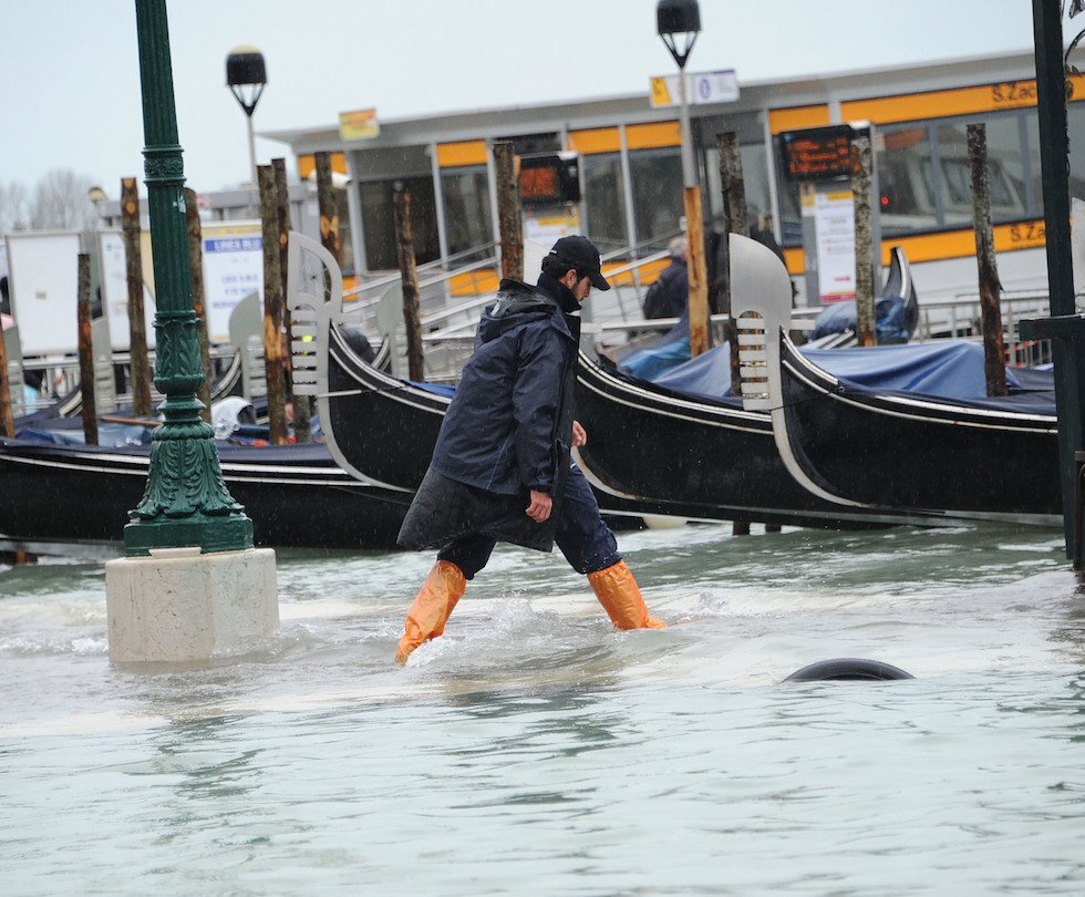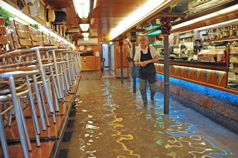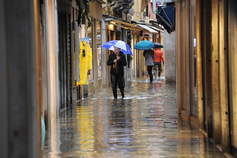 Так, залило значительную часть пешеходных улиц, туристы и жители города вынуждены ходить по помостам.