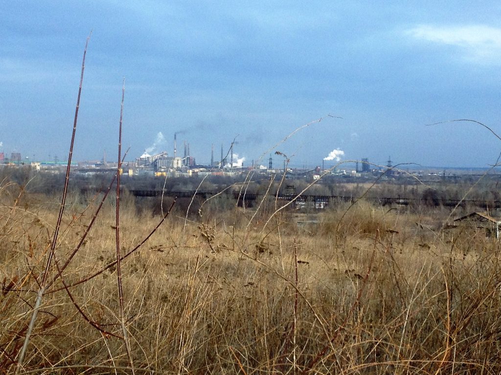 Вид с территории хвостохранилища на дымящие заводы Каменского.