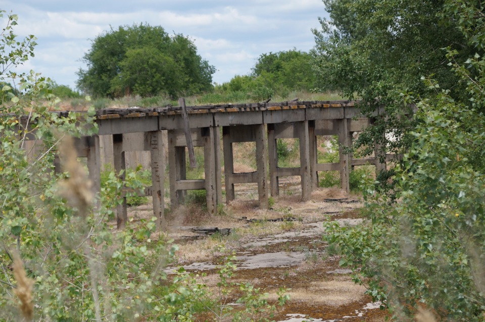 Пишут, что очень сильно фонят эти бетонные конструкции. Вероятно, это остатки пульпопроводов, по которым радиоактивная пульпа поступала в илонакопители. Их за 30 лет даже не демонтировали и не закопали в землю.
