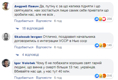 "Поздравили с наступающими праздниками?! Убийцу украинцев, который нарушил все международные законы?" "В феврале с захватом Дебальцево поздравляйте. В марте с годовщиной оккупации Крыма. Поздравляйте, чего уж тут", "Слуга" поздравил хозяина", – пишут в комментариях.