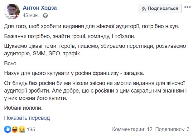“Без русских бы мы никогда, конечно, не смогли издание для женской аудитории сделать. Но хорошо, что есть русские с этим сакральным знанием, и у них можно его купить”, — возмутился блогер Антон Ходза.