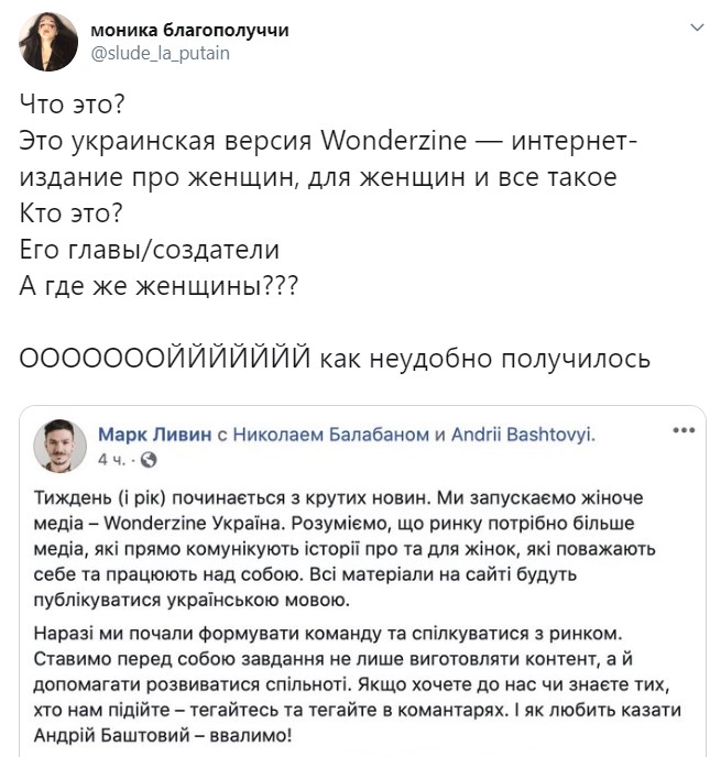 “Неделя (и год) начинается с крутых новостей. Мы запускаем женское медиа — Wonderzine Украины. Понимаем, что рынку нужно больше медиа, которые прямо коммуницируют истории о и для женщин, которые уважают себя и работают над собой. Все материалы на сайте будут публиковаться на украинском языке”, — сообщил Марк Ливин.