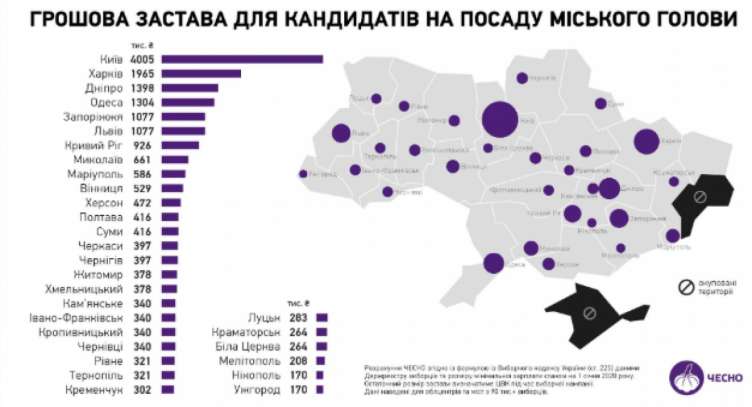 Розрахунки ЧЕСНО на основі формули із Виборчого кодексу України свідчать, що розмір застави для кандидата у міські голови облцентру чи великого міста від 90 тисяч виборців буде становити щонайменше 170 тисяч гривень (Ужгород).