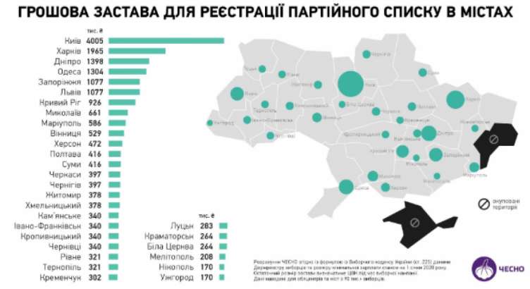 Формула розрахунку застави для кандидатів у міські голови і для реєстрації партійних списків ідентична і залежить від кількості зареєстрованих у місті виборців та від розміру мінімальної заробітної плати. Тобто, партії, що у Києві змагатиметься і за посаду міського голови, і за депутатські крісла, доведеться одноразово викласти понад 8 мільйонів гривень.