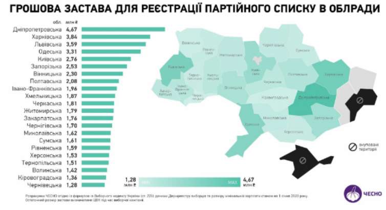 Так, найдорожче обійдеться реєстрація списку кандидатів у депутати Дніпропетровської обласної ради — майже 4,67 мільйонів гривень. Якби вибори до парламенту відбулися цього року, то розмір застави для партії був би всього на кількадесят тисяч гривень вищим (4,72 мільйонів).