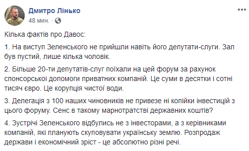 Политик, доброволец АТО Дмитрий Линько считает, что пользы от посещения форума для Украины не будет и деньги налогоплательщиков потрачены впустую.