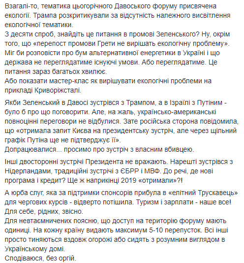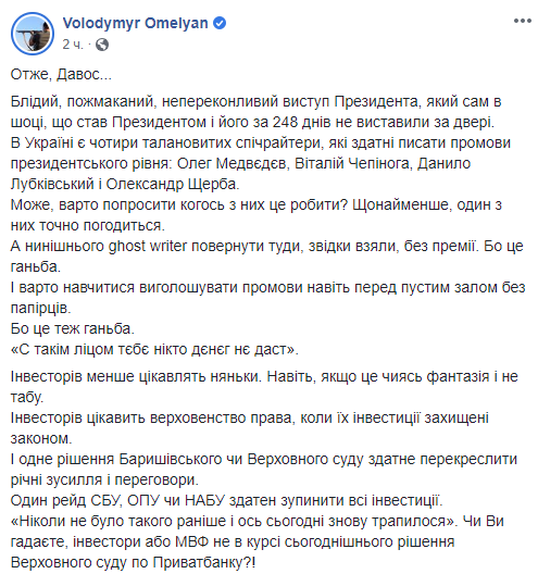 Политик и дипломат, бывший Министр инфраструктуры Владимир Омелян считает выступление Зеленского провалом по многим причинам. Политик отметил, что инвесторов интересуют не няньки, а верховенство права в Украине для нормального ведения бизнеса. К тому же, Зеленский обошел стороной главную тему форума – экологию.