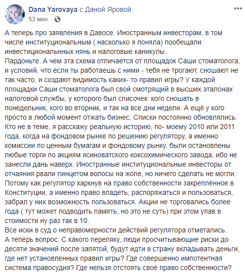 О плохом инвестиционном климате в Украине пишет и блогер, волонтер Дана Яровая.
