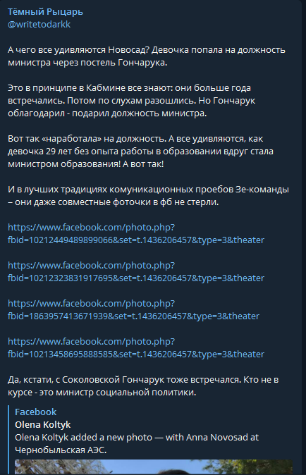 “А чого всі дивуються Новосад? Дівчинка потрапила на посаду міністра через ліжко Гончарука. Це в принципі в Кабміні всі знають: вони більше року зустрічалися. Потім за чутками розійшлися. Але Гончарук віддячив – подарував посаду міністра”, – йдеться у повідомленні.