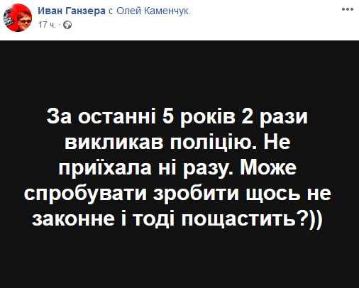 На своей странице в Facebook Иван написал, что это не первый случай, когда полиция не приезжает на вызов: "За последние 5 лет два раза вызывал полицию. Не приехала ни разу. Может попробовать сделать что-то незаконное и тогда повезет?".