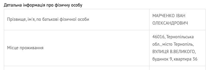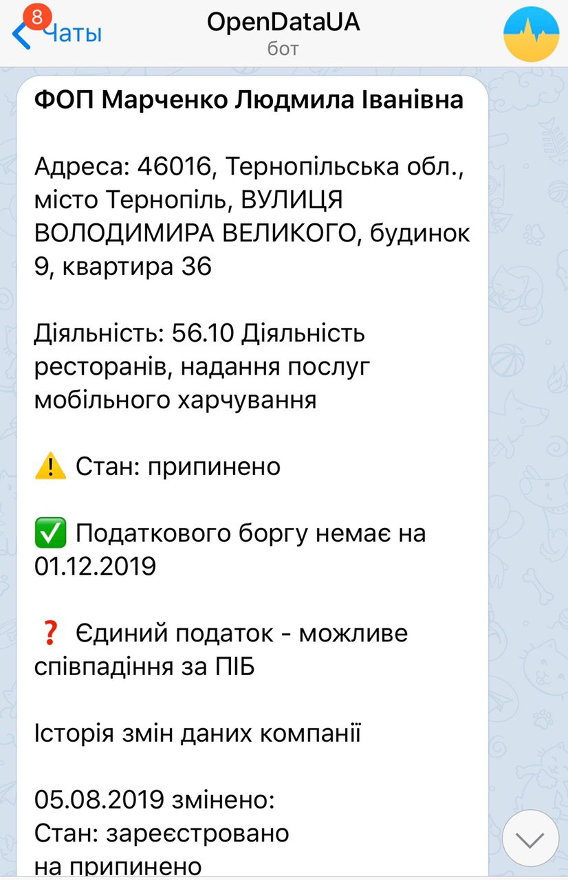 Под «ФОП Марченко Иван» скорее всего имеется в виду муж Людмилы — Иван Александрович Марченко. Он зарегистрирован как физическое лицо-предприниматель по адресу улица Владимира Великого 9 в Тернополе. Ресторан Бограч расположен по тому же адресу.