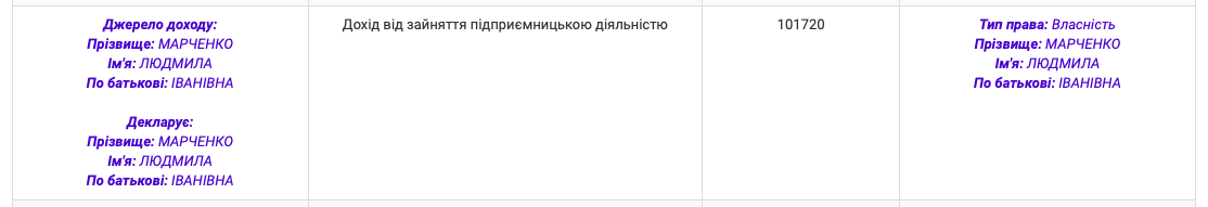 При этом, в декларации Марченко указано, что за 2018 год она получила 101 720 грн дохода от осуществления предпринимательской деятельности.