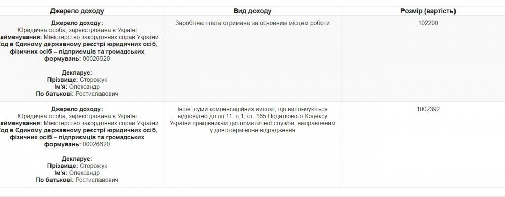 Чиновник декларировал две зарплаты в 102 тыс. и 1 млн гривен от МИД в качестве суммы компенсационных выплат работникам дипломатической службы.