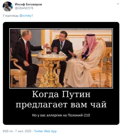 Лукашенко отказался от совместной трапезы с Путиным. - Сам жри свой "новичок" на воде - подумал Лукашенко, но вслух сказал то, что положено по этикету... pic.twitter.com/ok3zyLYe59