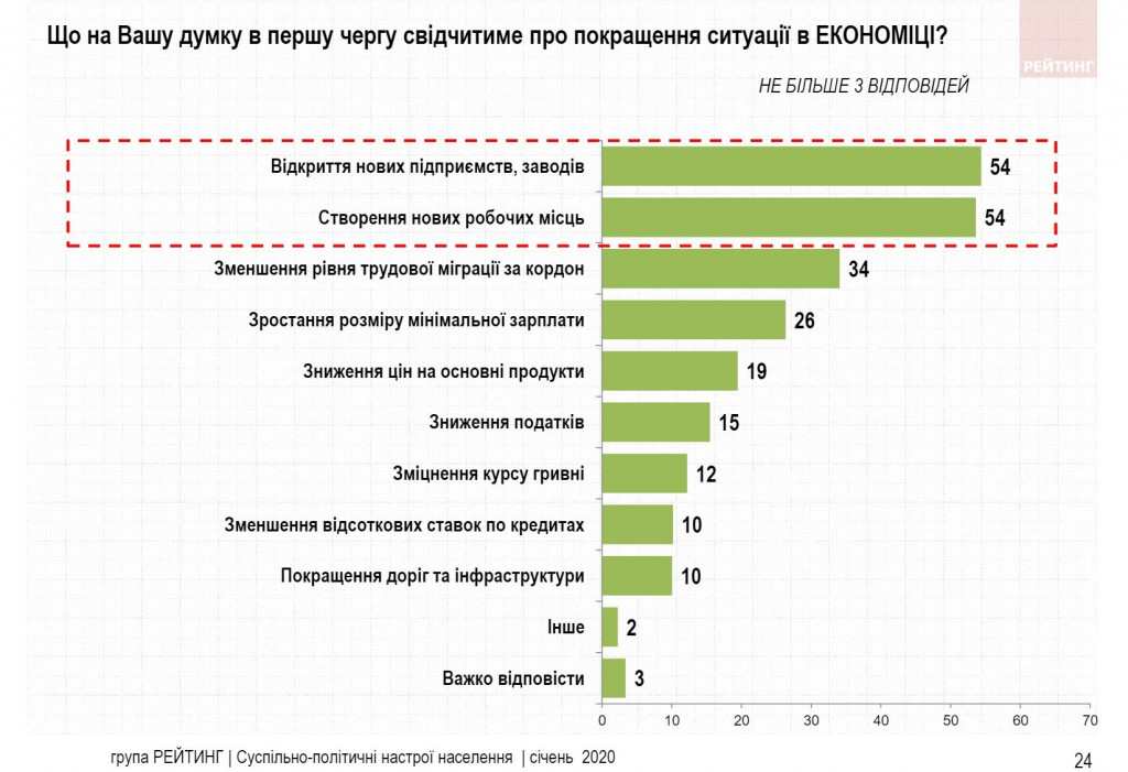 По данным “Рейтинга”, основными маркерами положительных изменений в экономике респонденты считают открытие новых предприятий (54%) и создание новых рабочих мест (54%). 34% считают, что об улучшении будет свидетельствовать снижение уровня трудовой миграции за границу, 26% – рост размера минимальной зарплаты, каждый пятый – снижение цен на основные продукты.