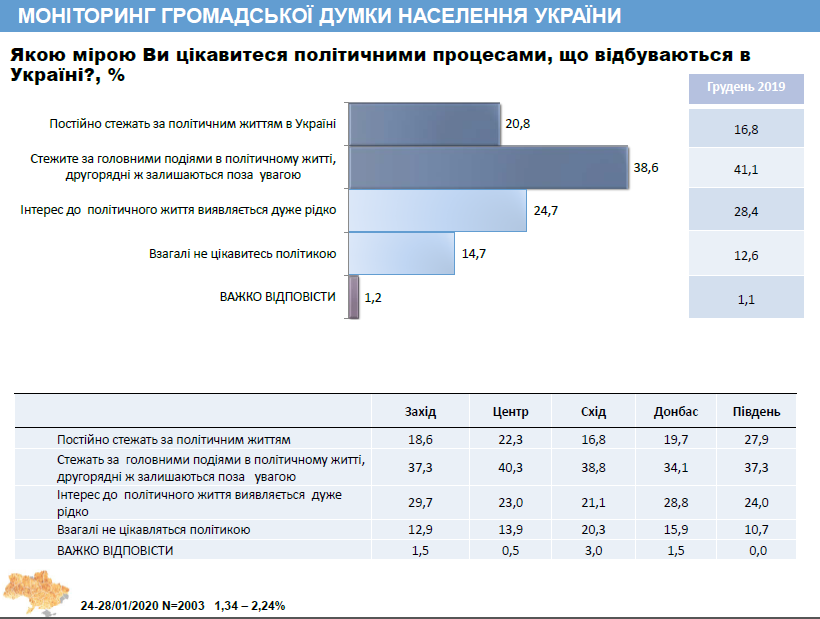 В сравнении с данными за декабрь 2019 года, которые приводят социологи, респондентам все интересней мониторить политическую жизнь страны (интересуются полностью — 16,8, лишь главным — 41,1%, редко — 28,4%, вовсе нет — 12,6%).