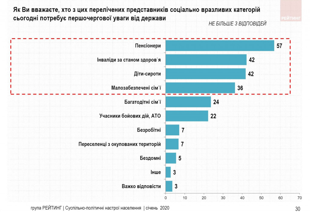 Пенсионеры – категория населения, среди наиболее уязвимых, которая, по мнению опрошенных, требует первоочередного внимания от государства (57%). По 42% респондентов считают, что власти следует обратить внимание в первую очередь на инвалидов по состоянию здоровья или детей-сирот. 36% утверждают, что в первую очередь следует помогать малообеспеченным семьям. По 22-24% так говорят о многодетных семьях и участниках боевых действий, АТО.