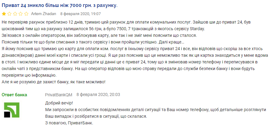 «Войдя в приват 24 был шокирован тем, что на счету осталось 56 грн, а было 7500, 7 транзакций с какого сервиса Starday», — объясняет свою проблему мужчина.