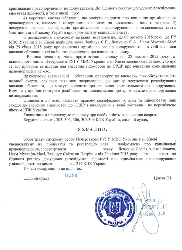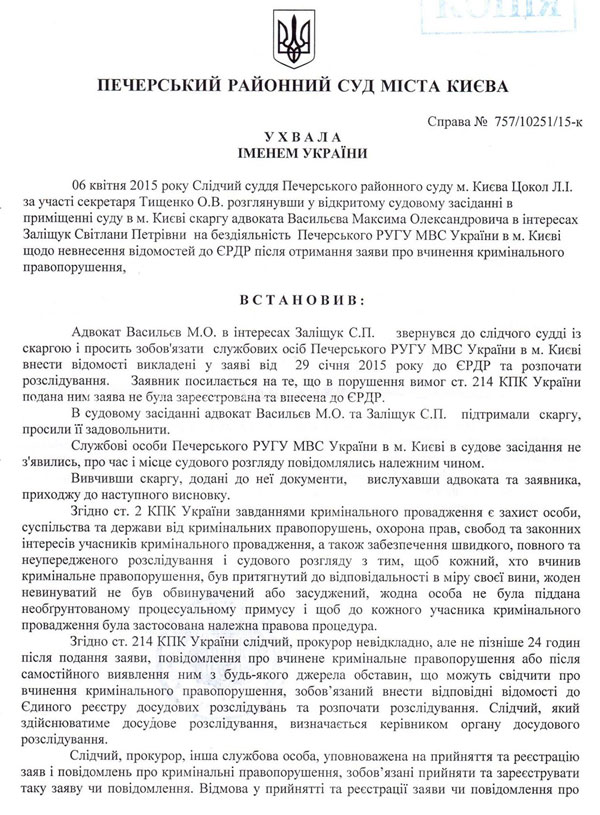 Попри очевидну підробку документів Хорошковським, Печерський райвідділ міліції відмовився реєструвати заяву про злочин та починати розслідування. І у понеділок за скаргою Світлани Заліщук Печерський райсуд зобов’язав їх провести слідство.