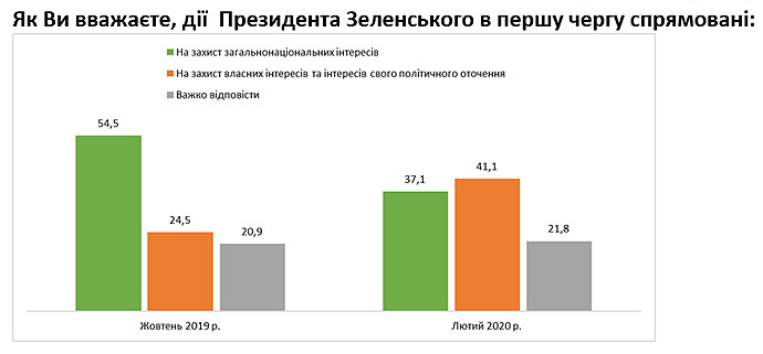 В феврале 2020 года президенту Зеленскому доверяют 51,5%, не доверяют – 41%. Социологи отмечают, что уровень доверия к Зеленскому был самым высоким в сентябре 2019 года – тогда ему доверяли 79% граждан, не доверяли – только 13,5%.