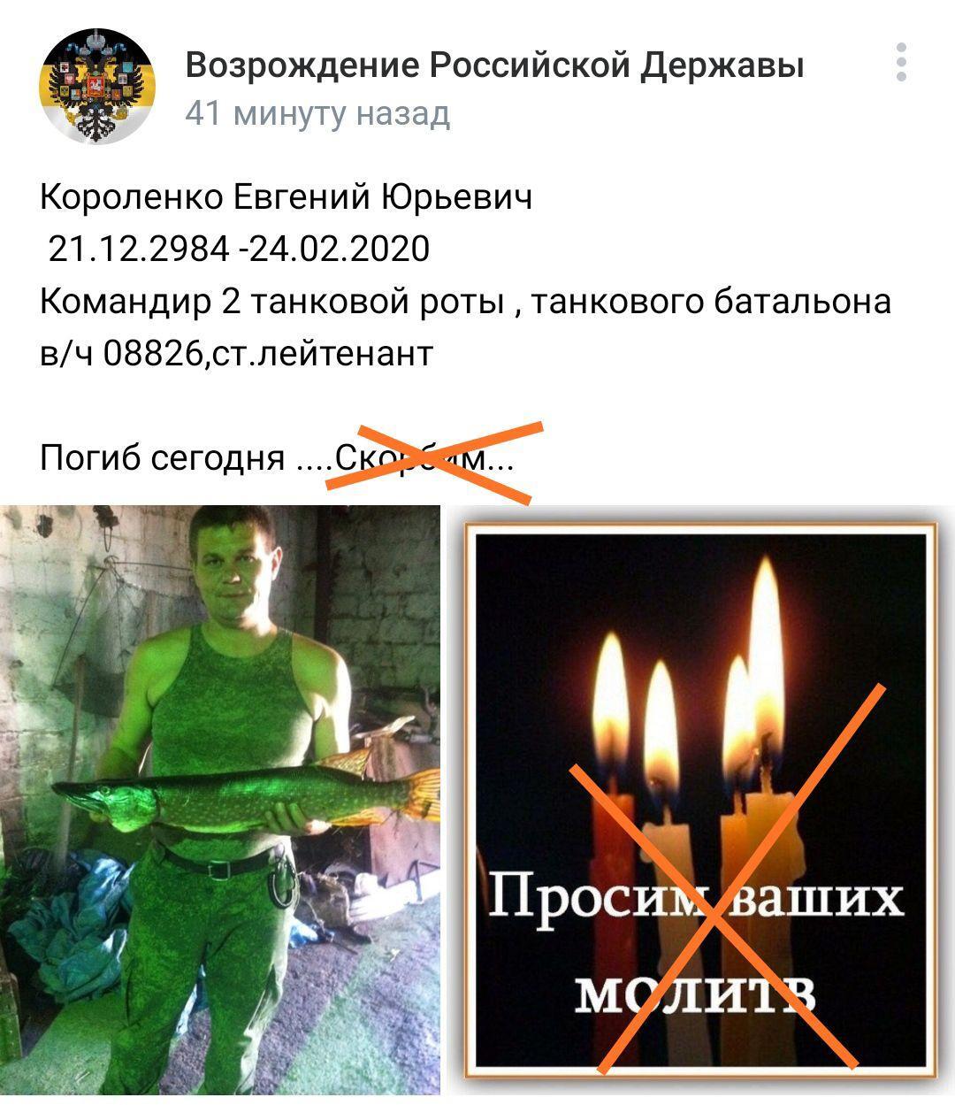 Так, 24 января погиб боевик Короленко Евгений Юрьевич, который был командиром танковой роты танкового батальона "республики". Об этом, ссылаясь на сообщения пособников оккупантов в соцсети, написал офицер ВСУ Анатолий Штефан ("Штирлиц") в Telegram.