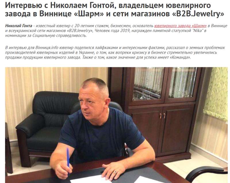 Николай Гонта. Скриншот сайта Вінниця.infoСам предприниматель так описывает свой старт в ювелирном бизнесе: “В 1999 году я создал свою мастерскую в Виннице: подобрал команду будущих мастеров и оплатил им учебу. К 2003 году штат работников фирмы Шарм насчитывал 150 человек с большой сетью магазинов и 2000 клиентами по оптовым продажам”.