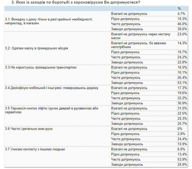 В частности, рекомендации выходить из дома только в случае крайней необходимости никогда не придерживаются или редко придерживаются 15% опрошенных, тогда как всегда придерживаются 39%. Не надевают маску в общественных местах 47% (из них 23% из-за нехватки масок, а 14% считают не нужным), всегда одевают 23%. Рекомендацию не пользоваться общественным транспортом не выполняют 20%.