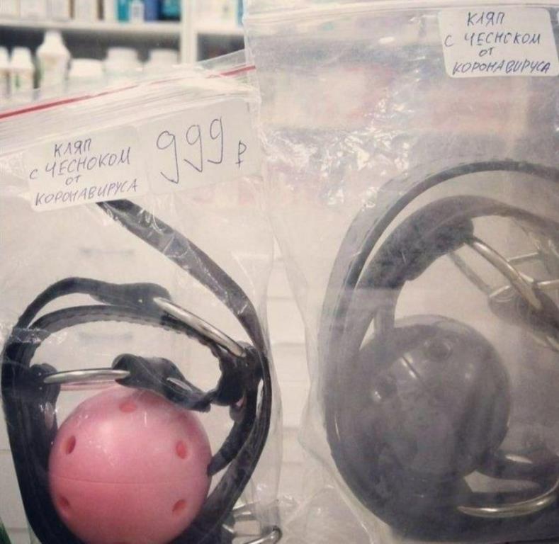В то же время в России из-за искусственного дефицита средств дезинфекции, продают альтернативные "способы защиты" – кляпы из секс-шопов, смазанные чесноком.