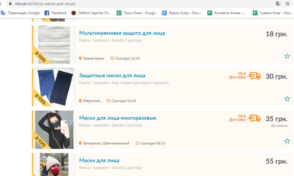Если загуглить «Маски для лица OLХ», мы видим, что таких объявлений на сайте очень много, и часть из них в топе. Получается, что команда модераторов или не дорабатывает. Или блокирует такие объявления рандомно.