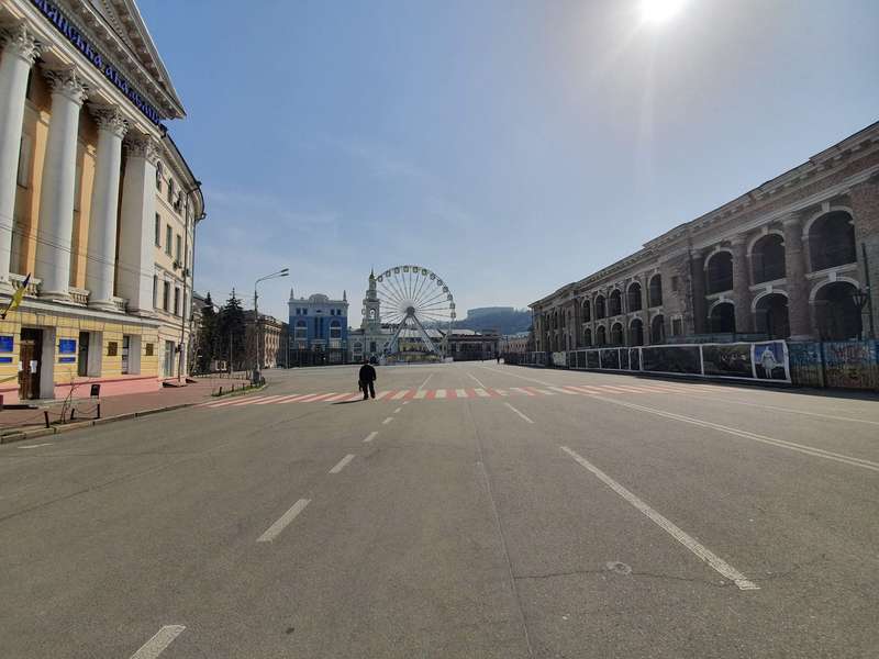 В частности, он показал практически безлюдную Контрактовую площадь – в кадр попали всего несколько прохожих.