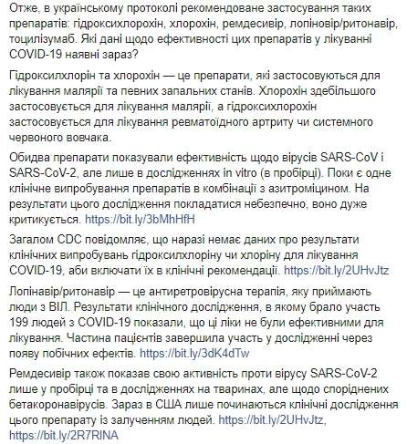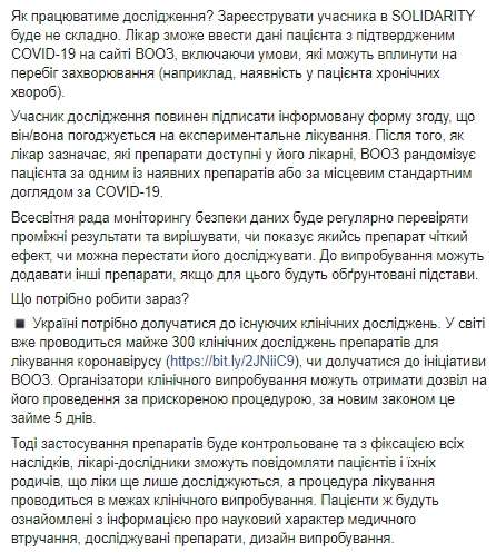 По данным Супрун, все препараты, включенные в украинский протокол имеют недоказанную эффективность и несут потенциальную опасность для пациентов. Она добавила, что ВОЗ начинает клинические исследования препаратов от коронавируса. В частности будет изучаться эффективность четырех препаратов и их комбинаций относительно действия на SARS-CoV-2.