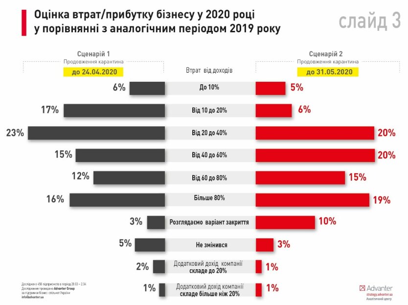 У випадку, якщо карантинні заходи залишаться без змін, 69% підприємств оцінюють втрати у більш ніж 20% протягом 2020 року в порівнянні з 2019 роком. А якщо карантин буде продовжено до кінця травня, то втрати більше 20% зазнають вже 84% підприємств, а 44% - зазнають втрати більше 60% або розглядають варіант закриття бізнесу.