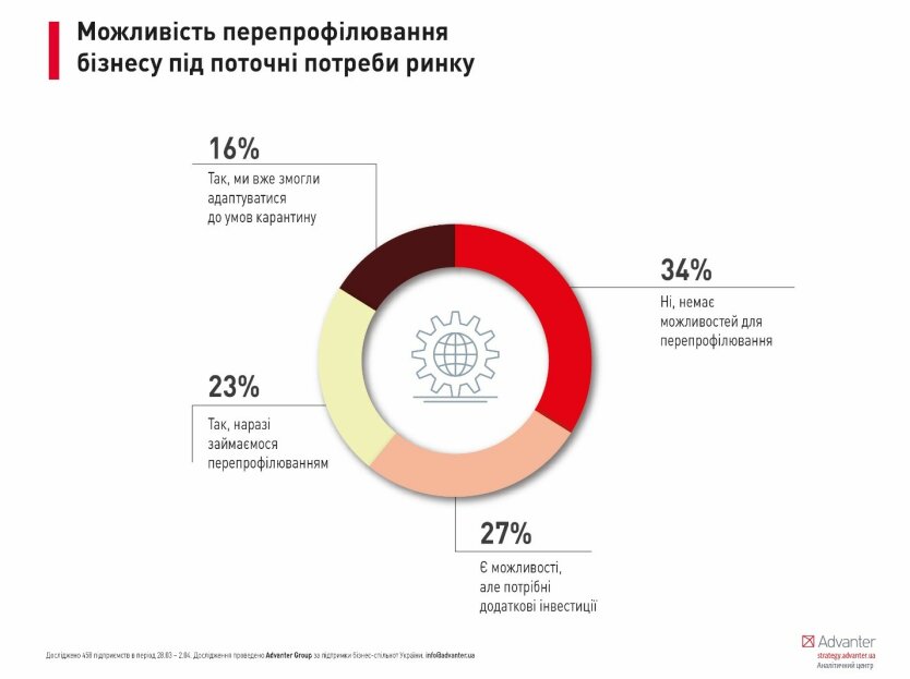 Advanter Group опитали 458 підприємств, серед яких мікро-, малі, середні та великі підприємства. Дослідження проведено 28.03 – 2.04.2020 за підтримки CEO Club, бізнес-спільноти Board, ТПП України, бізнес-школи МІМ Київ, Prizma Club, CFO Club Ukraine та десятків інших об’єднань підприємців по всіх областях України.