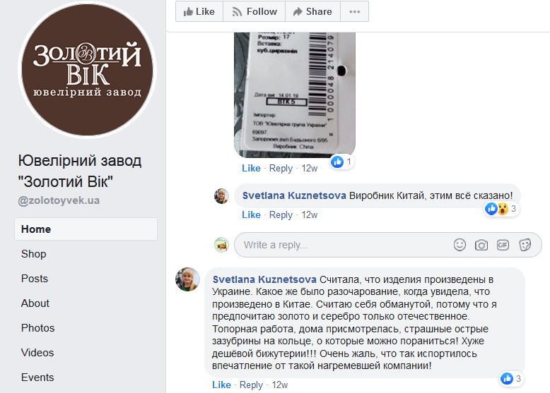 Представление о производителе можно составить по отзывам клиентов. Они возмущаются качеством продукции, приобретенной в сети «Золотой век». Указывают на несоответствие веса обозначенному на этикетке. Причем, у каждого обманутого покупателя свои сведения о заводе-производителе (который еще называют фабрикой). Некоторые пишут, что под видом «украинского ювелирного бренда № 1» приобрели в его брендовом магазине дешевый ширпотреб из Китая (см. фото ниже), которым сами Кравец и Зеленский вряд ли стали бы себя украшать…