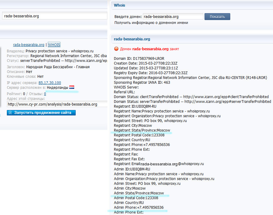 Начнем с интернет-страницы «Народной Рады Бессарабии», которая имеет адрес http://rada-bessarabia.org. Беглый анализ сайта с помощью онлайн сервиса «CY-PR» показал, что «бессарабы» по неведомым причинам предпочитают администрировать свой интернет-ресурс из Москвы, а не с Украины или Нидерландов (где физически он находится):