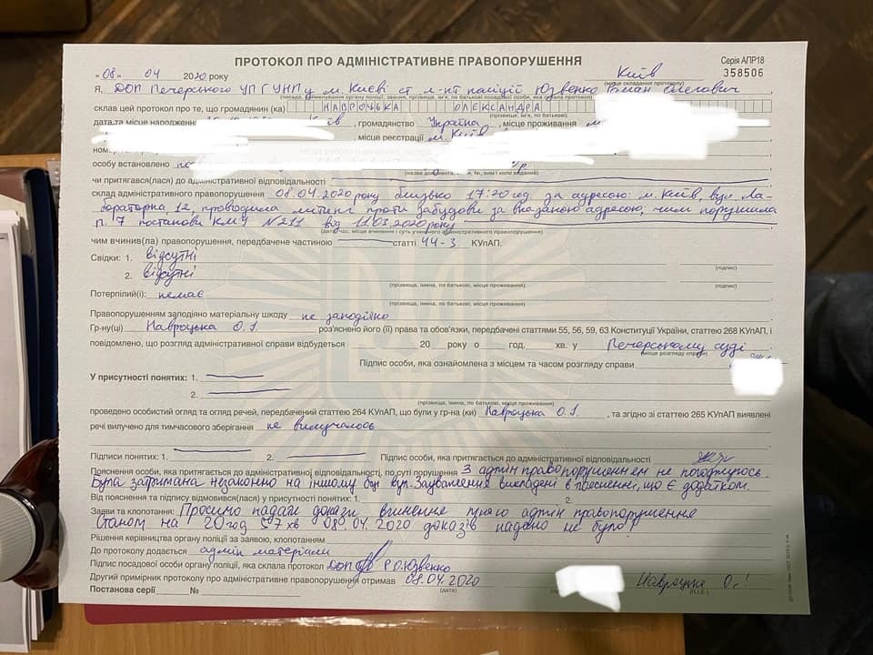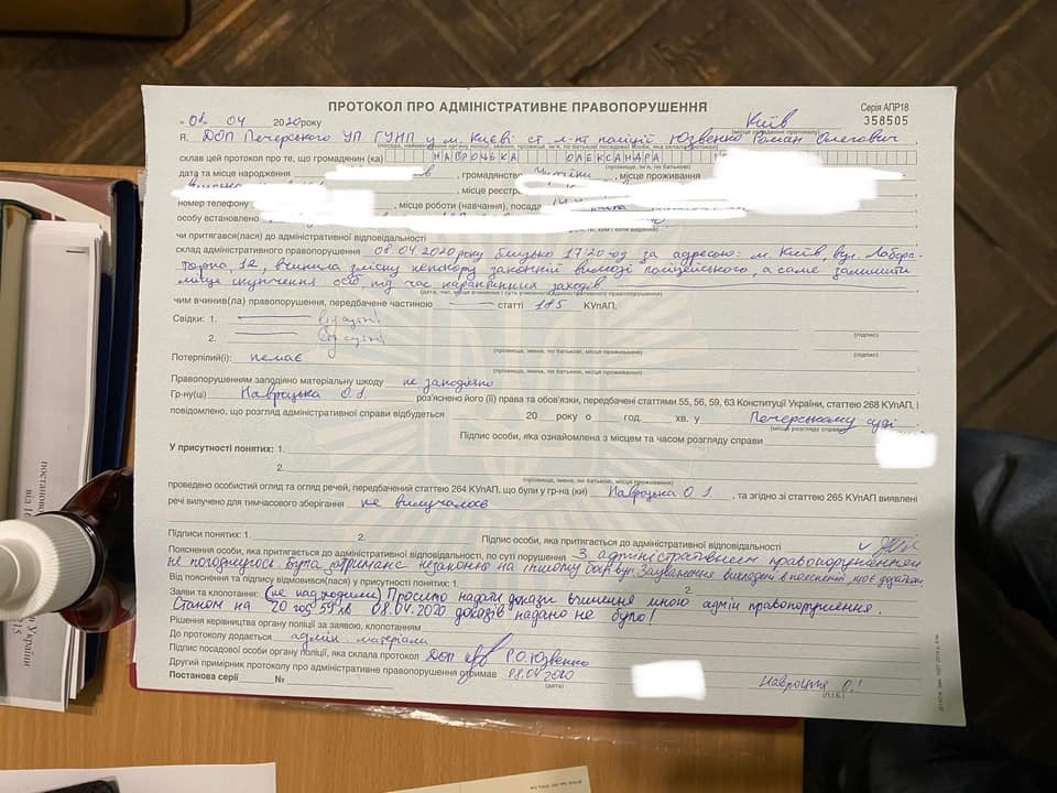 "Составили протоколы об административном правонарушении. Теперь мне грозит штраф на 17-35 тысяч гривен и еще штраф за неповиновение сотруднику полиции. Отпустили меня где-то через 4 часа, при этом написали в журнале, что в райотдел я была "приглашена"", – написала девушка.