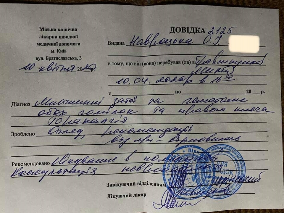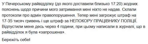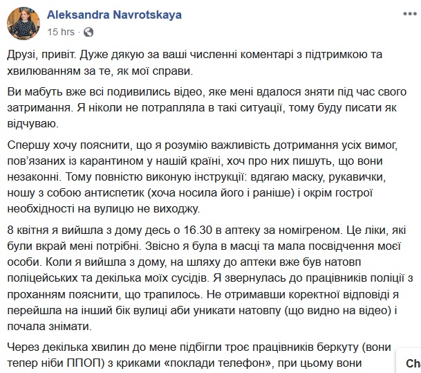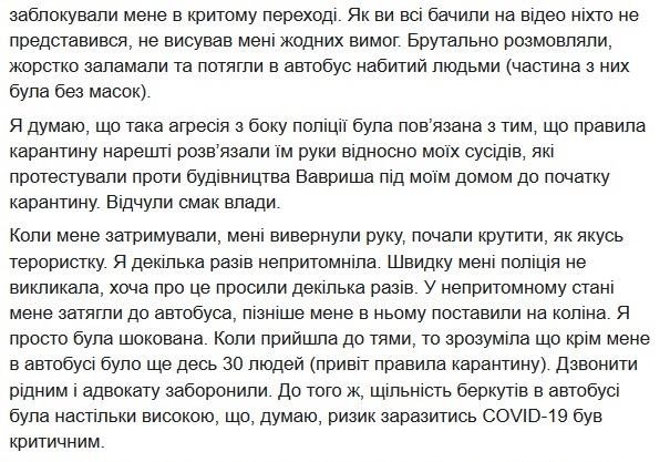 «8 апреля я вышла из дома примерно в 16.30 в аптеку за номигреном. Это лекарства, которые были крайне мне нужны. Конечно я была в маске и имела удостоверение моей личности. Когда я вышла из дома, на пути в аптеку уже была толпа полицейских и несколько моих соседей. Я обратилась к работникам полиции с просьбой объяснить, что случилось. Не получив корректного ответа я перешла на другую сторону улицы, чтобы избежать толпы (что видно на видео) и начала снимать. Через несколько минут ко мне подбежали трое работников Беркута (они теперь вроде ППОП) с криками „положи телефон“, при этом они заблокировали меня в крытом переходе. Как вы все видели на видео никто не представился, не предъявлял мне никаких требований. Грубо разговаривали, жестко заломили и потащили в автобус набитый людьми (часть из них была без масок)», — пишет она.