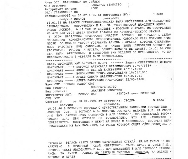 "Савопуло Иван поручил… устранить Алиева и Агаева, которые отказывались работать под Савопуло. К акции были приобщены боевики из Евпатории: Руслан и Русель, одного фамилия Веледжиев. 24.01.96 они оба были арестованы в Евпатории 6-м отделом по хулиганству, но по недоказанности 5 февраля были освобождены", – незатейливым языком свидетельствует милицейский агент.
