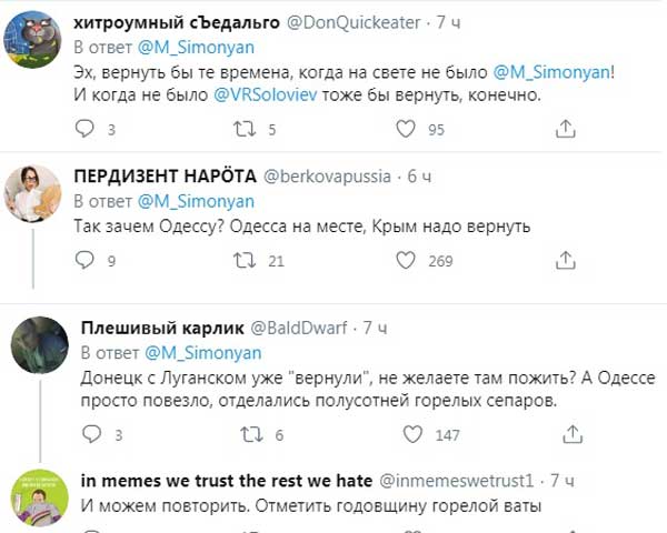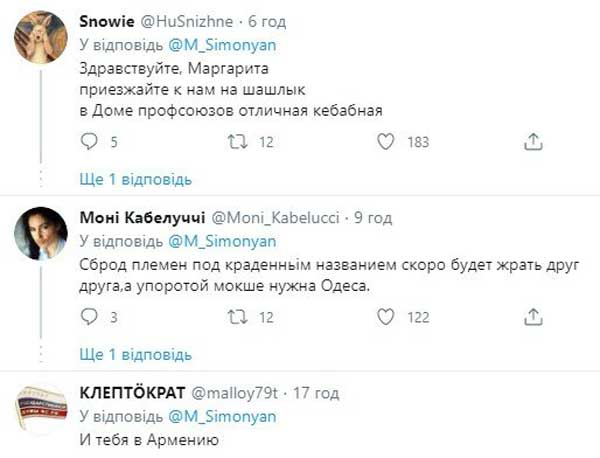 «Так зачем Одессу? Одесса на месте, Крым надо вернуть», «Сброд племен под краденьім названием скоро будет жрать друг друга, а упоротой мокше нужна Одеса», «Здравствуйте, Маргарита, приезжайте к нам на шашлык, в Доме профсоюзов отличная кебабная», «Маргарита, как только карантин снимут, без опаски приезжайте в Одессу. Дом профсоюзов подремонтировали, его двери всегда для вас открыты. Радушие и горячий прием будут обеспечены», — пишут «доброжелательные» пользователи.