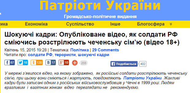 Как добавляет StopFake, изначально кадры из фильма разместило интернет-издание "Патріоти України" в новости с заголовком "Шокирующие кадры: Опубликовано видео, как солдаты РФ, смеясь, расстреливают чеченскую семью". Позже видео удалили, однако его уже распространили другие пользователи.