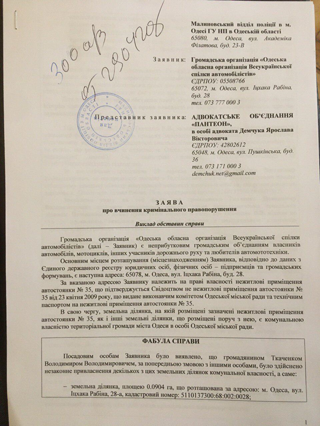 Тем временем члены Всеукраинского союза автомобилистов (численность которых достигает почти 15 тысяч) мириться со сложившейся ситуацией не собираются. Они требуют открыть уголовное производство в отношении Ткаченко В.В. и привлечь его к ответственности по статьям 190 ч.2 (мошенничество), 197-1 ч.2 (самовольных захват земельного участка) и 356 (самоуправство) УК Украины. За совершение указанных преступлений ему «светит» вполне реальный тюремный срок с конфискацией имущества. Автомобилисты подали соответствующее заявление в отношении Ткаченко в Малиновский райотдел полиции. Кроме того, члены Всеукраинского союза автомобилистов требуют, чтобы городская власть инициировала вопросы восстановления сроков и пересмотра в апелляции судебного дела судьи Жуковского, благодаря которому Ткаченко смог реализовать преступную схему по присвоении собственности территориальной громады.
